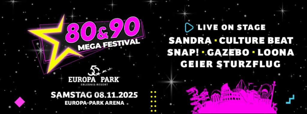 Wir feiern zusammen mit den geilsten, größten, und verrücktesten Hits der 80er & 90er ein grandioses Festival der Extraklasse in der Europa Park Arena. Am Samstag 08. November 2025 lautet das Motto: Runter vom Sofa und rein in’s Partyvergnügen!